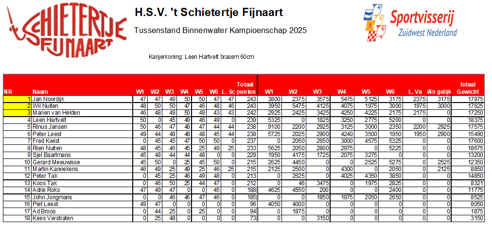 Maar bij een gelijke puntenstand gaat de regel in werking, dat zowel in fort als put de slechtste vangst afvalt. En dat werd een close finish. Uiteindelijk mocht Jan Noordijk, rechts op de onderstaande foto, zich Kampioen 2025 Binnenwater noemen.