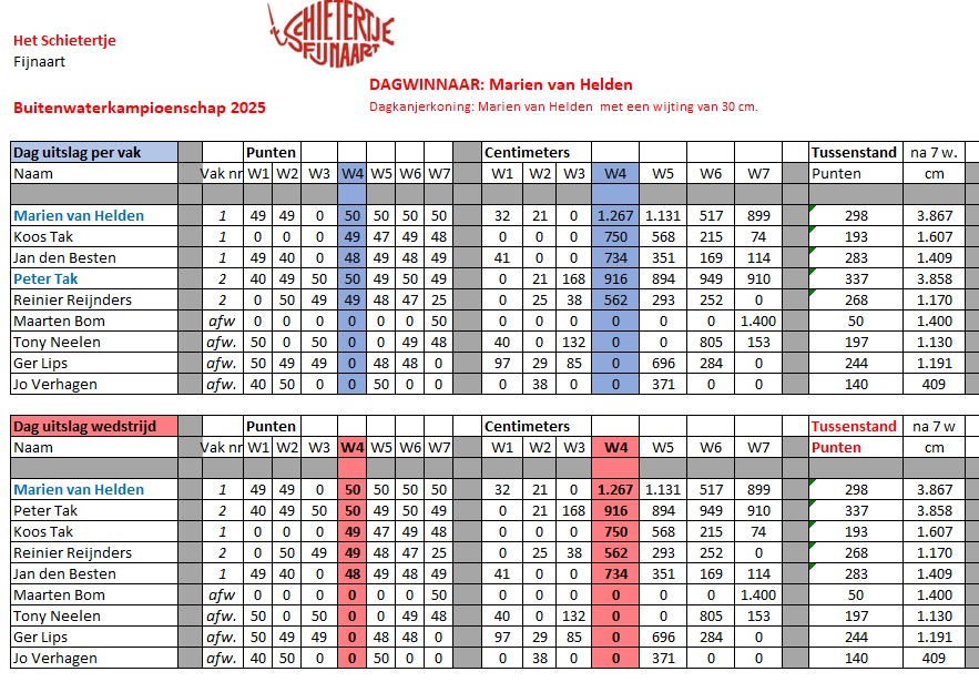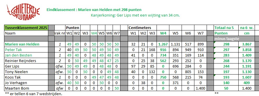 Peter Tak en Marien van Helden gingen er beiden meer dan 100% voor. En het werd een uitslag uiteindelijk in het totaal klassement, waar er 6 van de 7 wedstrijden telden, met 1 punt verschil (298 versus 297) en slechts 9 cm (3.867 versus 3.858 cm). Deze marges zijn in de loop der jaren nog nooit vertoond. Klasse!